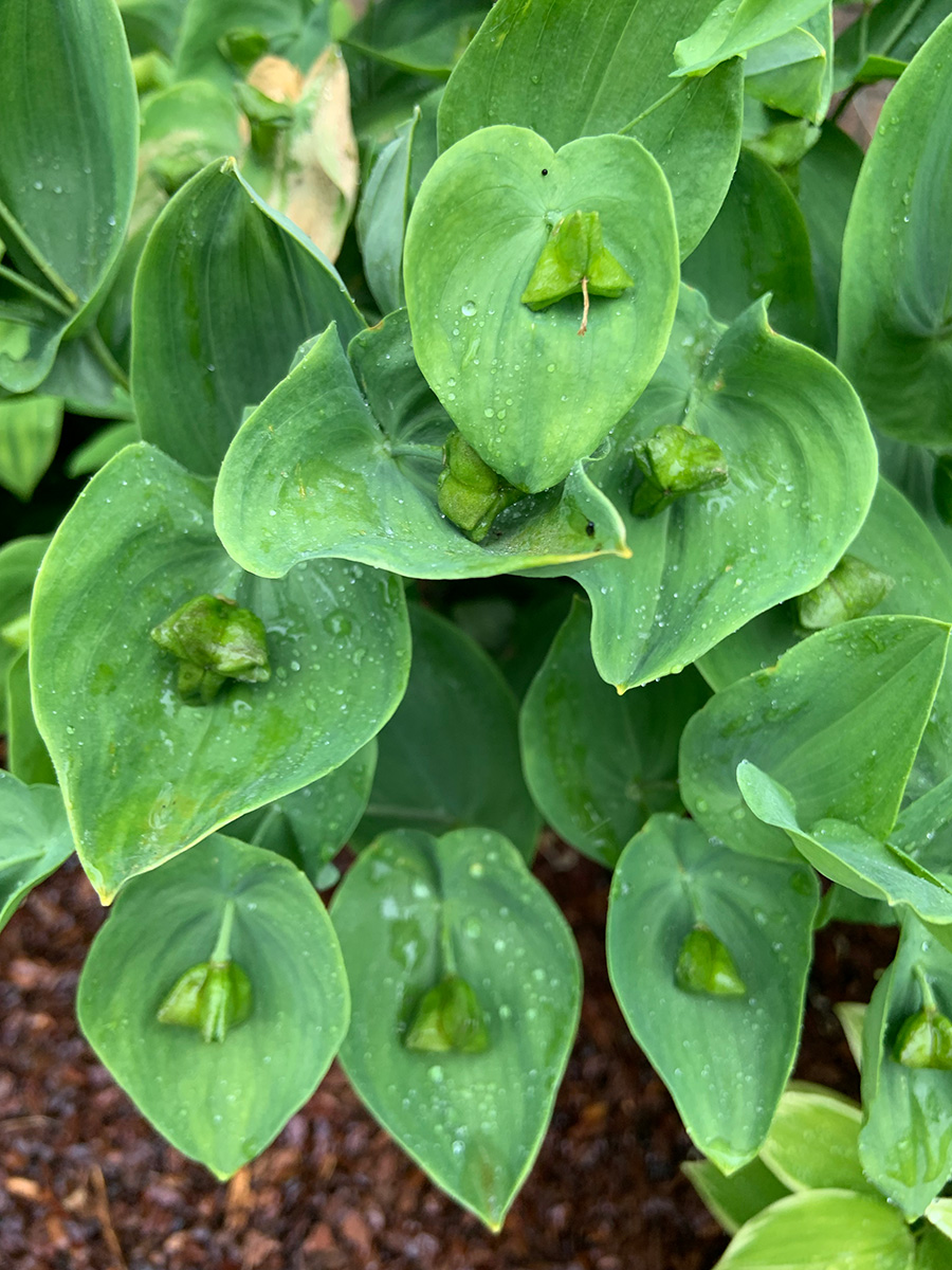 Rare hardy herbaceous perennial with wiry stems & small green leaves with a rich golden yellow variegation. Yellow bell shaped flowers in early Spring. Part shade/shade/moist soil. Protect new growth from slug damage.