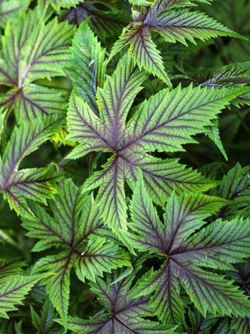 Striking tall clump-forming perennial with masses of terminal clusters of fragrant pink flowers July-August over maroon-crimson veined palmate foliage.